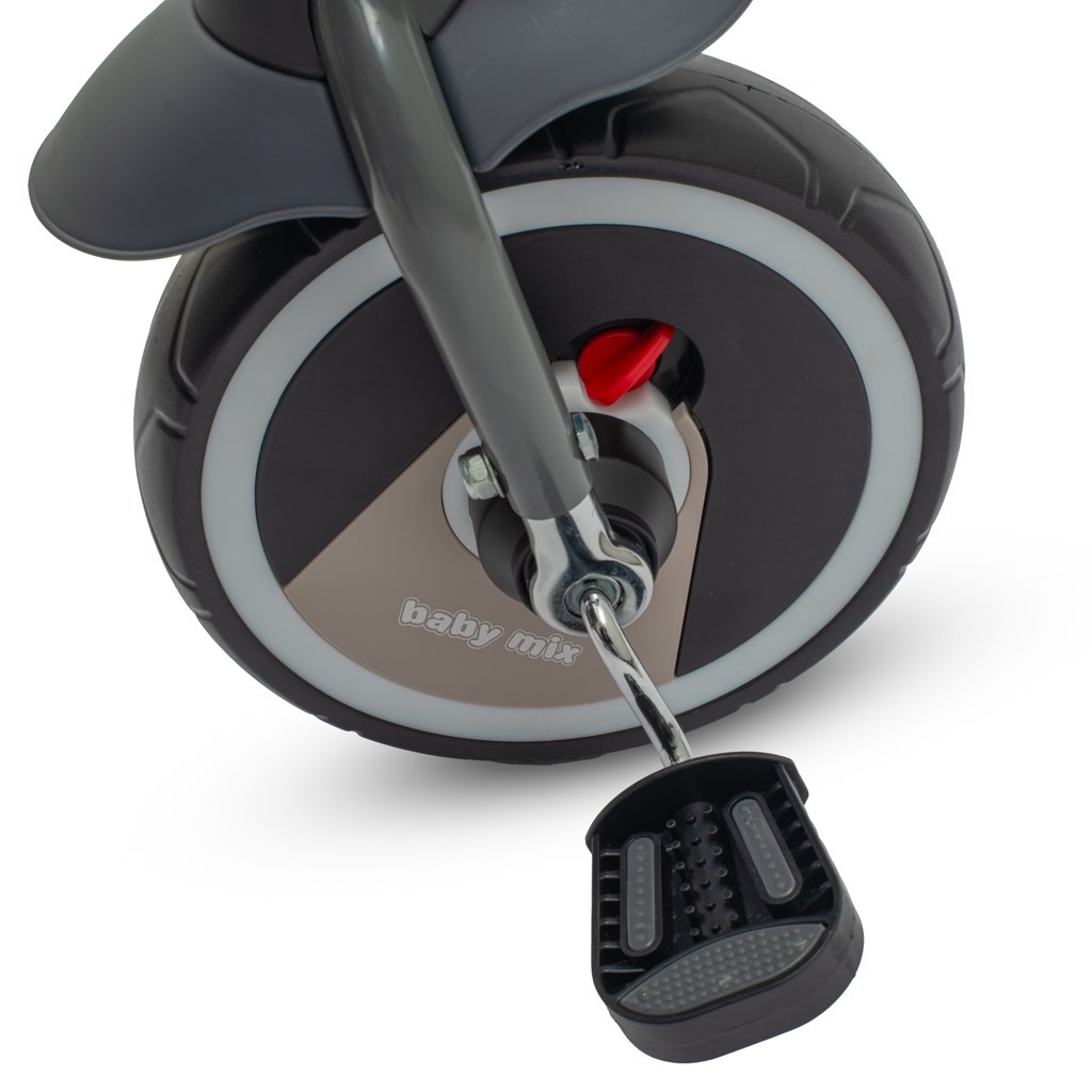 A Baby Mix 5 az 1-ben RELAX pedálos gyerek tricikli egy többfunkciós járgány, amely a többi GROW UP termékhez hasonlóan együtt nő a gyerekkel. A triciklit a gyermek és a szülő is kezelni tudja egy állítható tolókar segítségével. A tolókar, a napellenző és egyéb alkatrészek eltávolítása után a járgány tricikliként funkcionál. Modern felépítésű tricikli ergonomikus kialakítású, kényelmes üléssel, amely eltolható és 360 fokban elforgatható, így a gyerek a haladási irányban vagy azzal szemben is haladhat. Kiváló minőségű, tartós anyagokból készült, összecsukható szerkezetének köszönhetően könnyen szállítható például a csomagtartóban. Összeszerelése rendkívül egyszerű és intuitív, nem igényel szerszámokat. A közlekedés során a levehető kiesésgátló keret, az ötpontos biztonsági öv, a megerősített EVA habból készült kényelmes lábtartók és kerekek gondoskodnak a kényelemről és biztonságról, amelyek nagyszerűen elnyelik az ütéseket, tökéletes tapadást biztosítanak, és nem igényelnek utánfújást. Praktikus kosarában játékok és más kellékek is tárolhatók.