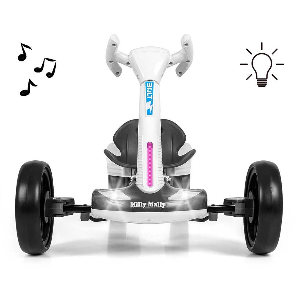 Ajándékozz gyermekednek valódi vezetési élményt. A BOLT Milly Mally elektromos gokart egy modern akkumulátoros gokart 3 éves kortól, amely ötvözi a sportos dizájnt, a biztonságot és a rengeteg szórakozást. A két motornak, a LED világításnak és a távirányítónak köszönhetően a vezetést a gyerekek és a szülők is élvezhetik – otthon és a szabadban is.