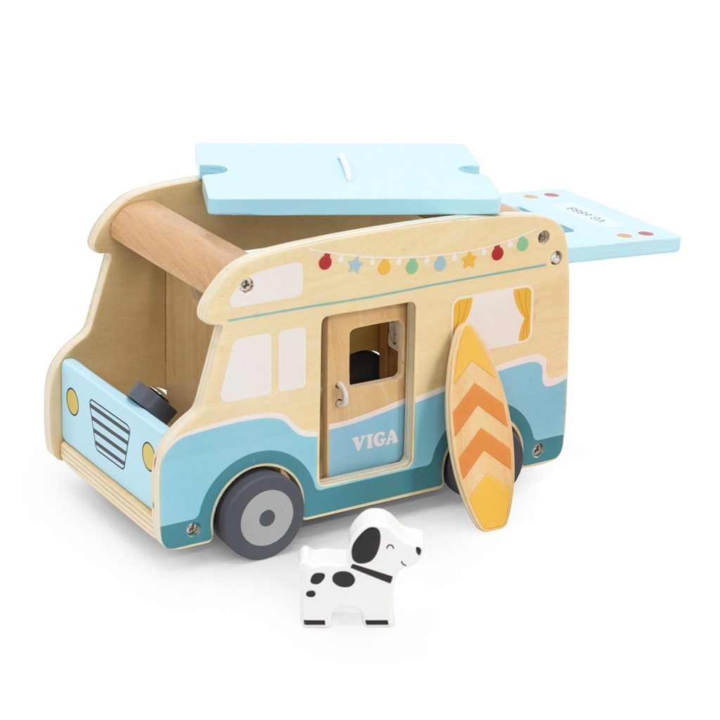 A fa lakóautó egy különleges játék, amely elrepíti a gyerekeket a nyári kalandok és utazások világába! A készletet a gondtalan tengerparti nyaralások ihlették, és a részletes kidolgozásnak, valamint a valósághű funkcióknak – mint a tolóajtó, a felnyitható tető és a tetőcsomagtartó a szörfdeszkához – köszönhetően órákon át tartó, kreatív és élvezetes játékot biztosít. A kamper számos kiegészítőt tartalmaz: két fabábut (fiút és lányt), egy kutyust, napozóágyakat párnákkal, napernyőt, grillsütőt és szörfdeszkát, így a gyerekek különféle szerepjátékokat játszhatnak el – például utazást, pihenést a strandon vagy piknikezést.