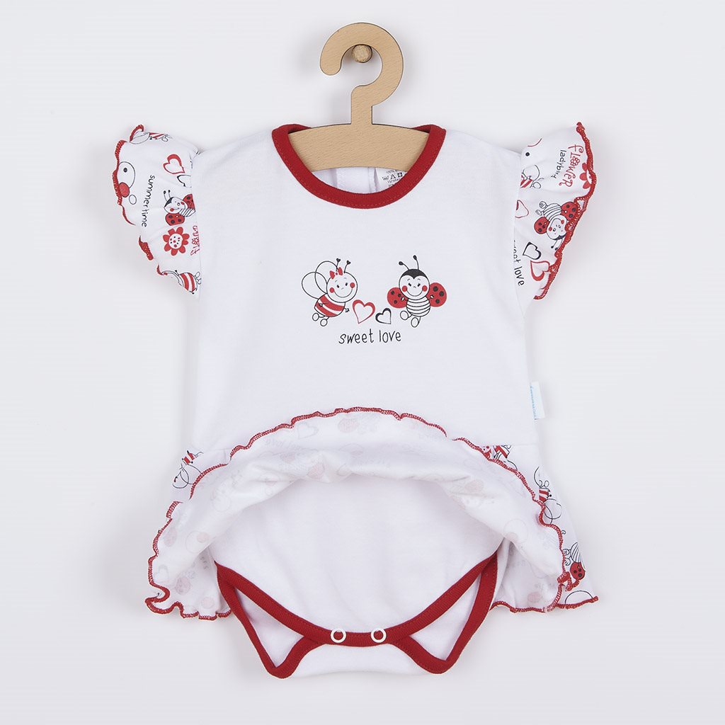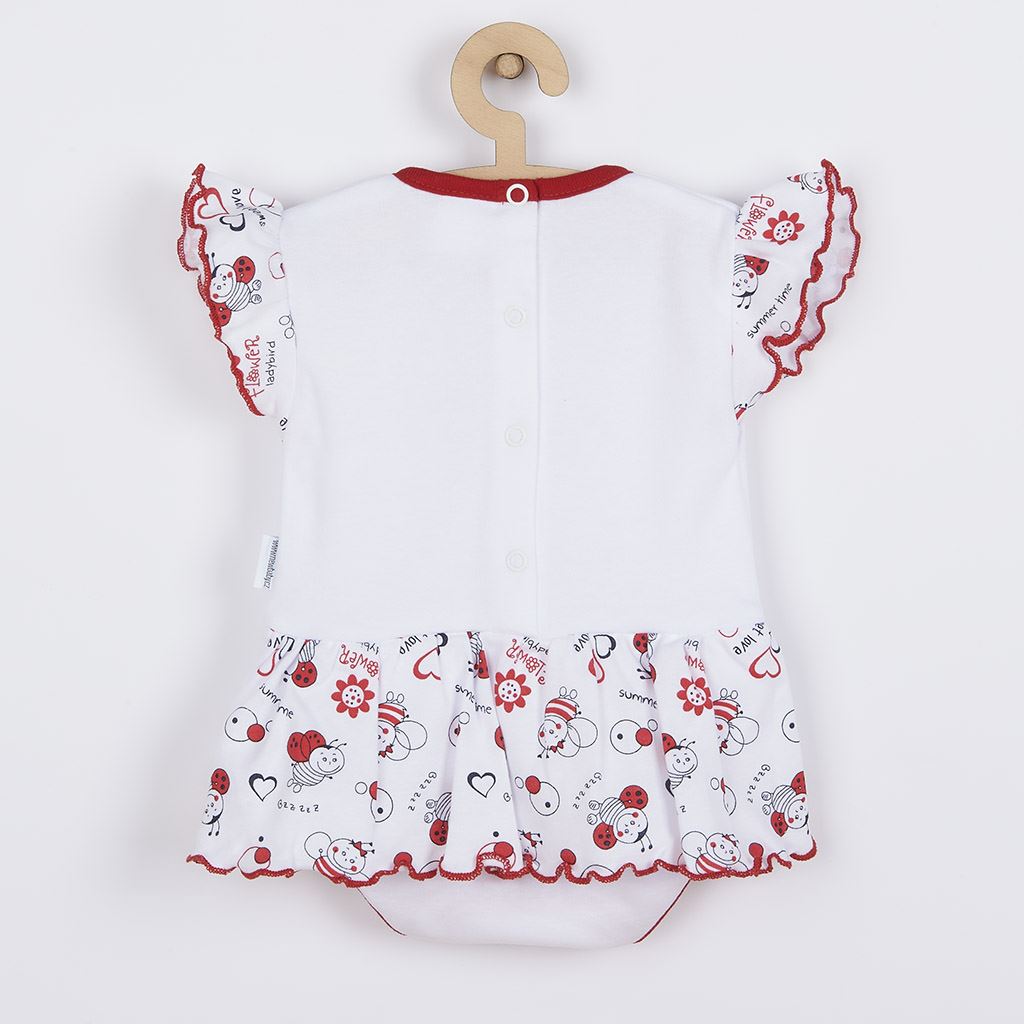 New Baby Katica rövid ujjú baba body. Fehér-piros, katica mintás, piros szegéllyel. Fodros ujj, rávarrt szoknyácska. Méretek: mellkas körüli átmérő cca 40 cm, teljes hossz cca 31 cm. Összetétel: 100% pamut.