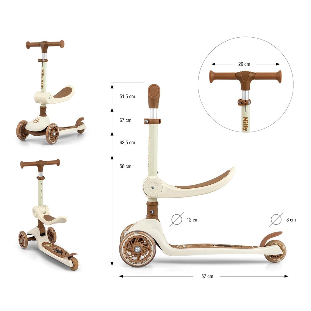 A roller együtt nő a gyermekkel. Először üléses futóbicikliként, később klasszikus rollerként használható.