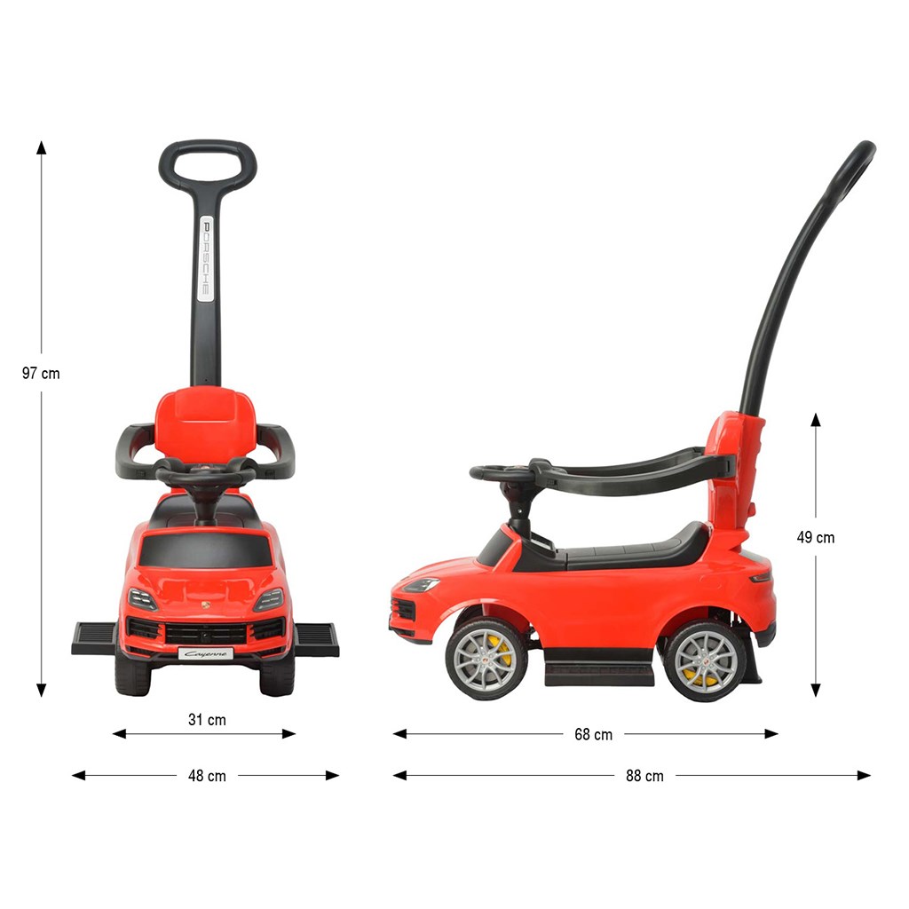 A Porsche Cayenne Milly Mally tolókarral ellátott bébitaxi egy valósághű kisautó, amely egyesíti a tolható jármű és a klasszikus bébitaxi funkcióját.