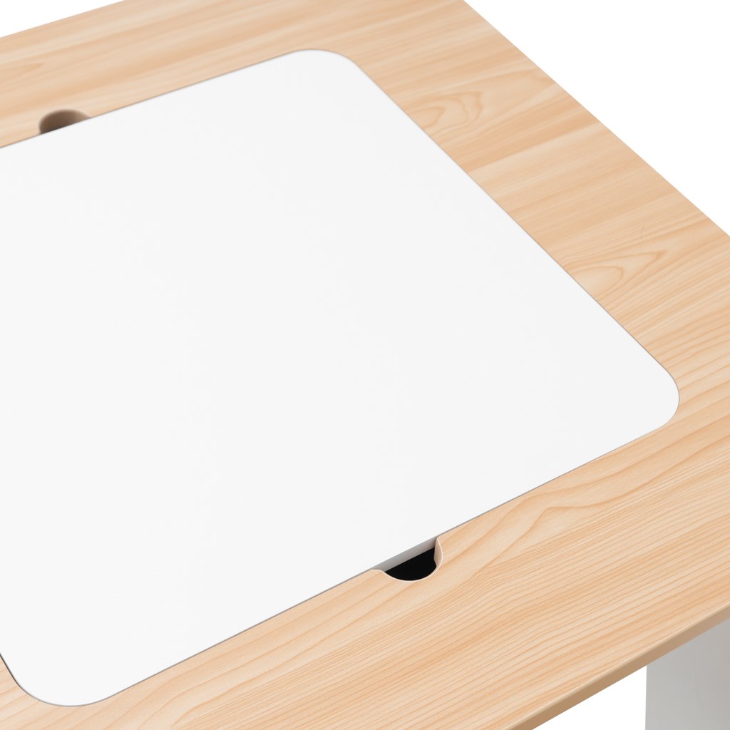A szett egy asztalt és két széket tartalmaz, amelyek tartós anyagból készültek a stabilitás és hosszú élettartam érdekében. Az asztal praktikus, levehető lappal rendelkezik – alatta tárolóhely található, ahová könnyedén elrejthetők a ceruzák, papírok, kisebb játékok vagy építőkockák. Így a gyerekeknek mindig kéznél van minden, miközben rendet is tartanak.
