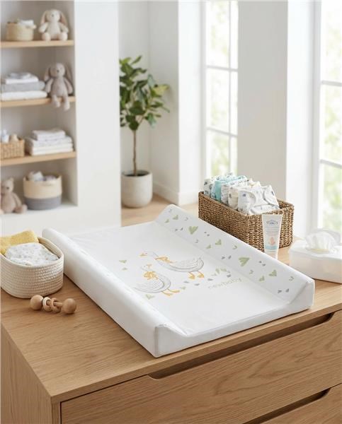 New Baby praktikusan alakított pelenkázó keret. Vízálló műanyag anyagból készült, libák képével díszített, kellemes pasztell színekben. A keret alja kemény deszkából készült. Töltete poliészter.