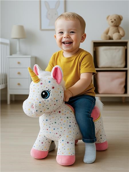 Plüss felfújható ugráló egyszarvú. A játék vidám szórakozást nyújt beltéren és kültéren is. Ugráskor a gyermek erősíti a lábát, megtanulja koordinálni a mozgásokat és fenntartani a stabilitást. Az ugráló kényelmesen a fülénél megfogható. A játék hangmodullal rendelkezik, a fül közé nyomva reális hangot ad ki a póni. Plüss anyaggal van bevonva, amely kellemes tapintású és nem csúszik. A csomagban egy pumpa is található.és egy elem (3xLR44).