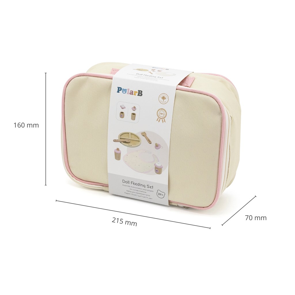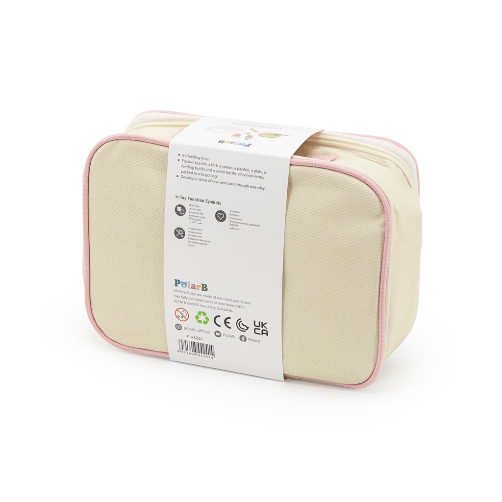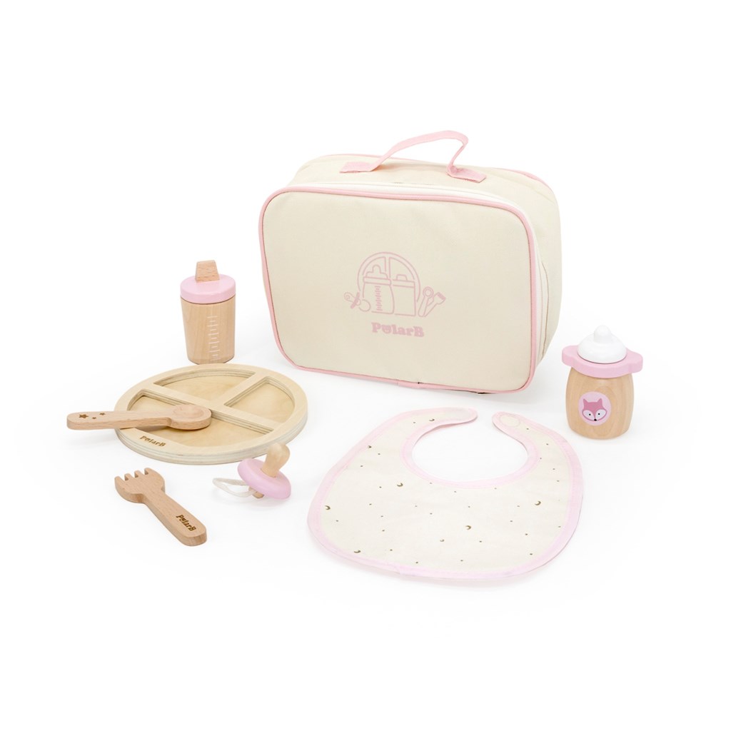 A készlet tartalma: előke, villa, kanál, cumi, tányér, etetőcumisüveg és vizes palack – mindez egy textil rendszerezőben csomagolva.