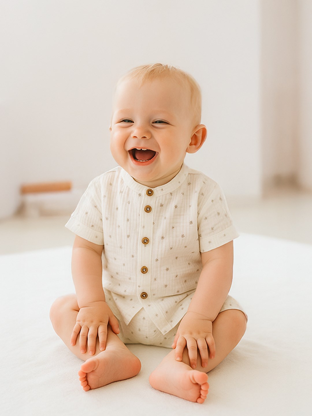 szélesebb gumival és „hamis” gombos záródással. Gyönyörű, légies szett kisfiúknak a nyári napokra. Az együttes pihekönnyű anyaga nagyon kényelmes viseletet garantál. A muszlin finomszövésű pamut anyag. A muszlin általában szoros szövésű fehérítetlen vagy fehér anyag, amelyet pamut gyöngyfonálból készítenek. Gyakran használják ruhák vagy függönyök készítésére. A muszlin jól levegőzik, ezért jó ruhaalapanyag a száraz, meleg éghajlatú területeken.