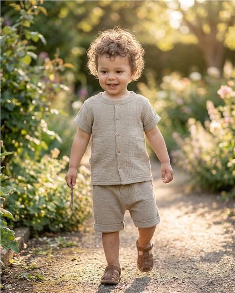 szélesebb gumival és „hamis” gombos záródással. Gyönyörű, légies szett kisfiúknak a nyári napokra. Az együttes pihekönnyű anyaga nagyon kényelmes viseletet garantál. A muszlin finomszövésű pamut anyag. A muszlin általában szoros szövésű fehérítetlen vagy fehér anyag, amelyet pamut gyöngyfonálból készítenek. Gyakran használják ruhák vagy függönyök készítésére. A muszlin jól levegőzik, ezért jó ruhaalapanyag a száraz, meleg éghajlatú területeken. Anyaga: 100% pamut. OEKO-TEX STANDARD 100.