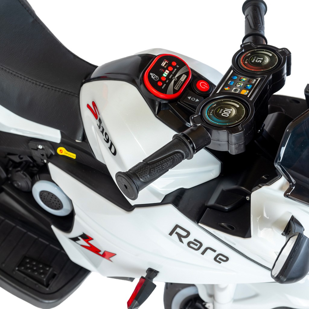 Rare Baby Mix gyermek elektromos motor 6V7AH akkumulátorral és két 380 teljesítményű motorral van felszerelve. Egygombos indítással rendelkezik, amely lehetővé teszi az előre és hátra menetet. A motor zenelejátszással, gyermekdalokkal, korai oktatási adatolvasó kártyával, három kerékkel és LED fényszórókkal van ellátva. Kényelmet a bőrülés biztosít.