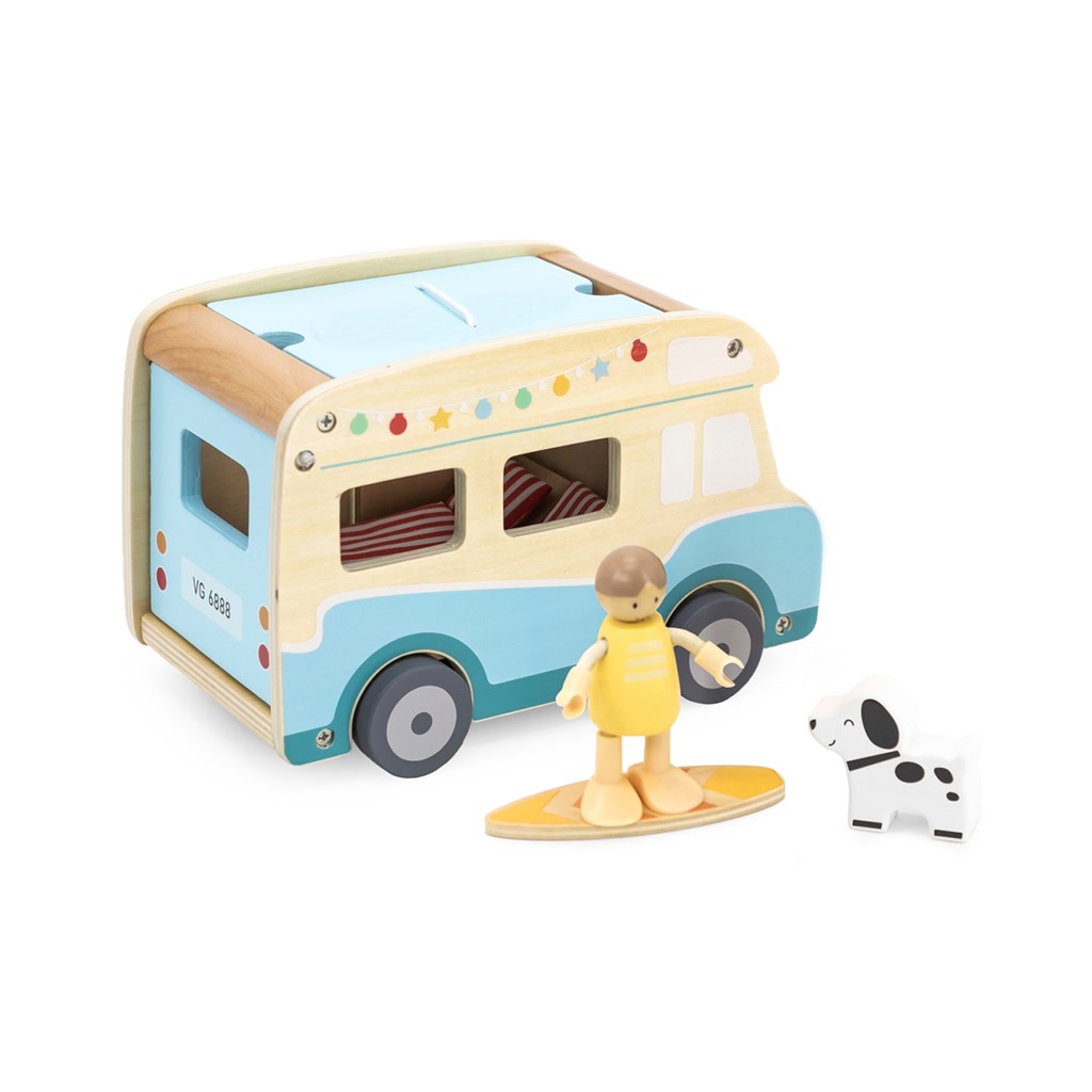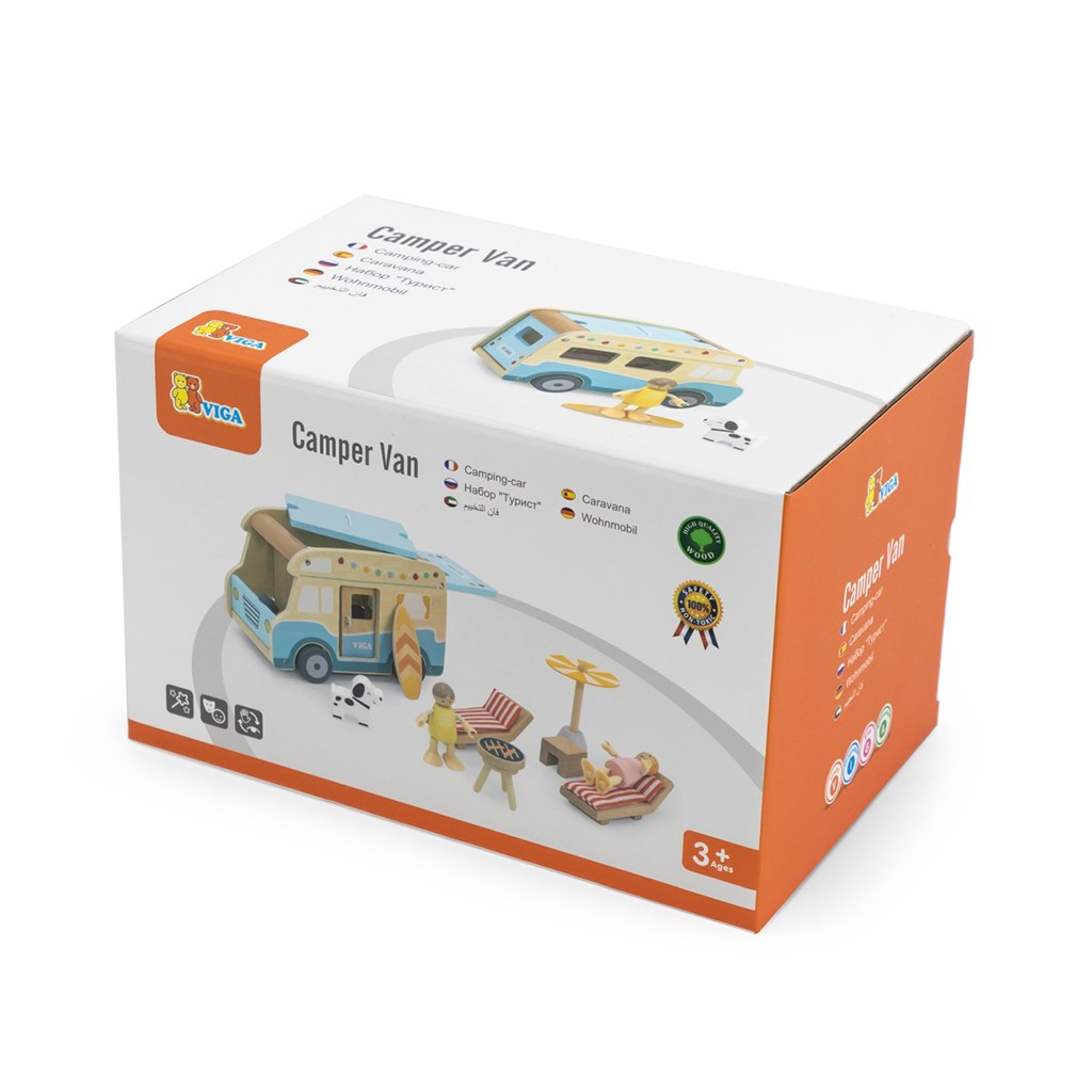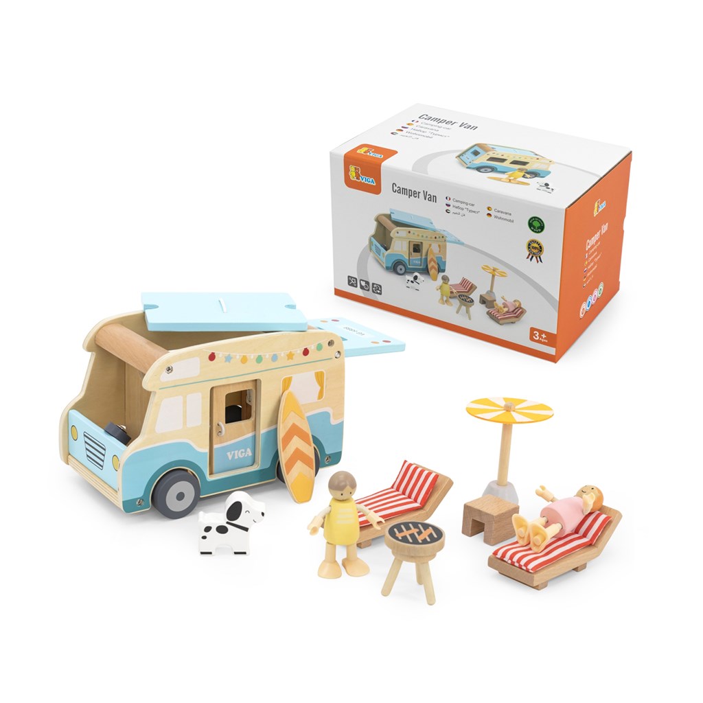 A fa lakóautó egy különleges játék, amely elrepíti a gyerekeket a nyári kalandok és utazások világába! A készletet a gondtalan tengerparti nyaralások ihlették, és a részletes kidolgozásnak, valamint a valósághű funkcióknak – mint a tolóajtó, a felnyitható tető és a tetőcsomagtartó a szörfdeszkához – köszönhetően órákon át tartó, kreatív és élvezetes játékot biztosít. A kamper számos kiegészítőt tartalmaz: két fabábut (fiút és lányt), egy kutyust, napozóágyakat párnákkal, napernyőt, grillsütőt és szörfdeszkát, így a gyerekek különféle szerepjátékokat játszhatnak el – például utazást, pihenést a strandon vagy piknikezést.