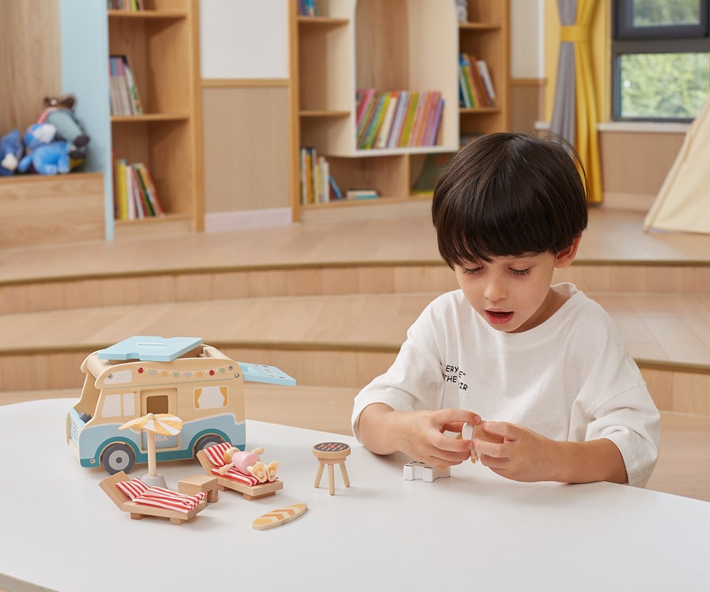 Képzelőerő fejlesztése – a fa kamper és a kiegészítők lehetővé teszik a gyerekek számára, hogy saját történeteket alkossanak, például nyaralásról, strandolásról vagy grillezésről