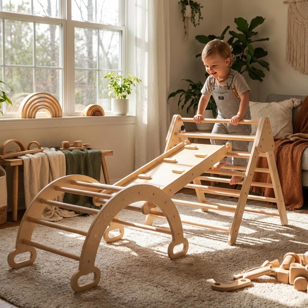 A fa Montessori (Pikler) mászó készlet Baby Mix természetes módon támogatja a mozgásfejlődést, az egyensúlyt és az önbizalmat. Variálható kialakításának köszönhetően több elemből áll, amelyek kombinálhatók és a gyermek életkorához, képességeihez igazíthatók.