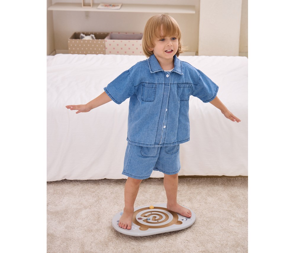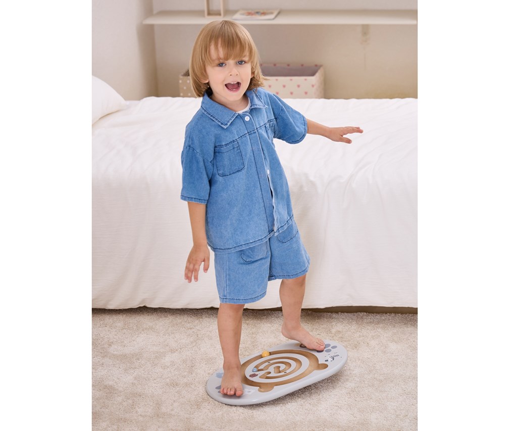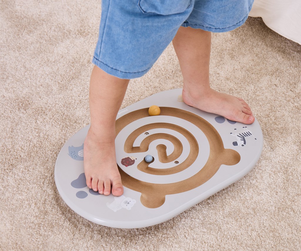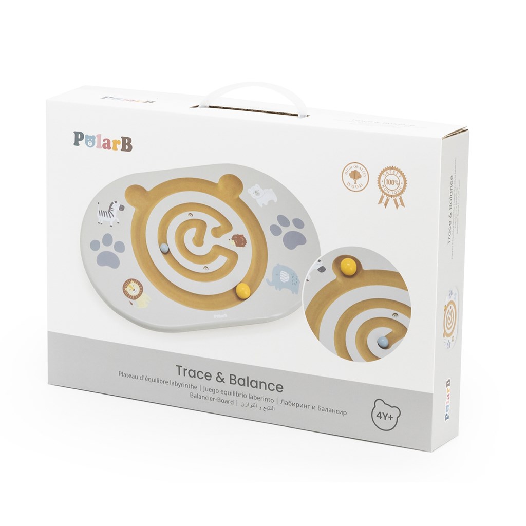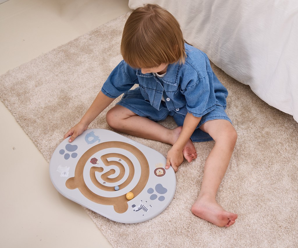 Egyensúlyozó labirintus egy kiváló játék 4 év feletti gyermekek számára, amely segíti az egyensúlyérzék, a mozgáskoordináció és a koncentráció fejlődését. A szett egy egyensúlyozó deszkát tartalmaz, amelyen egy maci alakú vájat és két fa golyó található. A gyermek feladata, hogy az egyensúlyozás során a golyót végigvezesse a labirintuson – ez remek módja a testkontroll gyakorlásának.