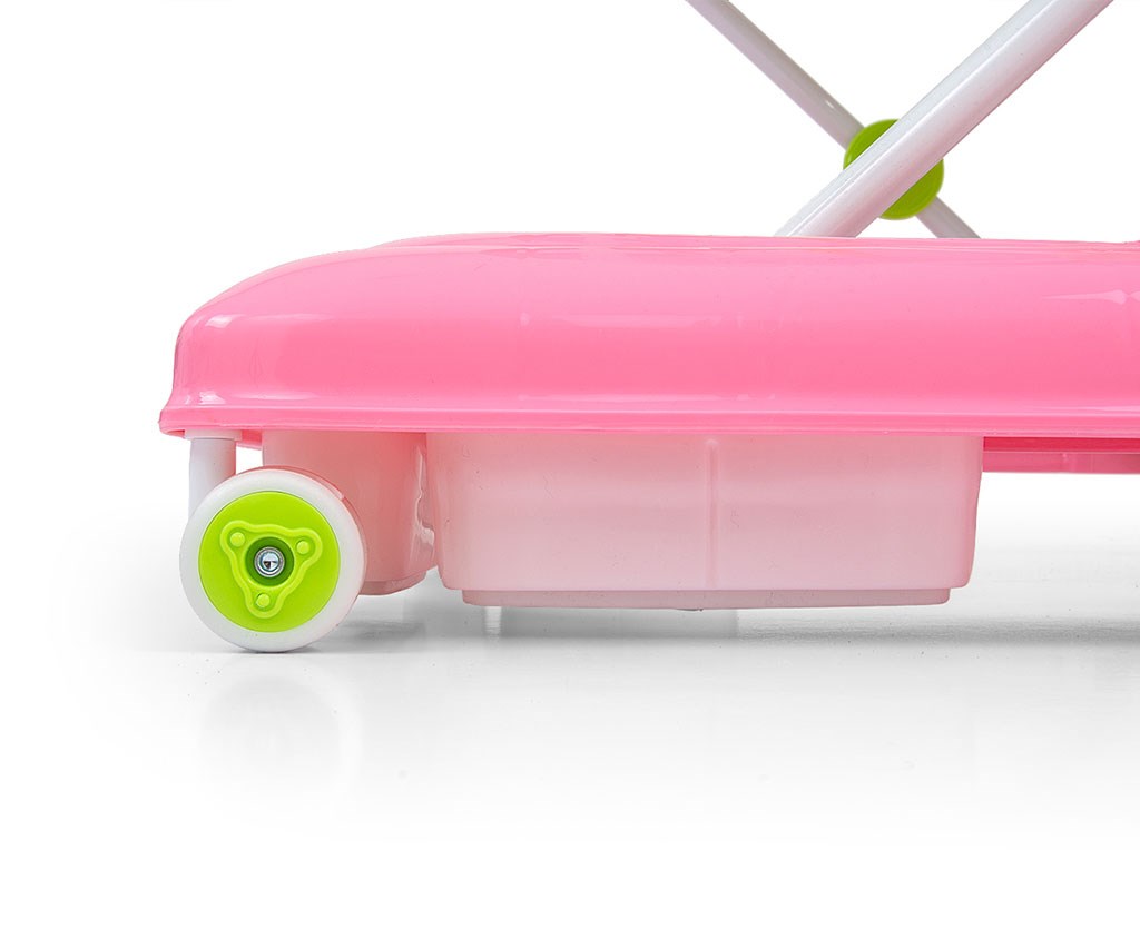 Négy kiváló minőségű forgó kerék, amelyek nem karcolják meg a felületet, amelyen mozognak, biztosítja a mozgás szabadságát, nyolc gumiütköző pedig megóvja a gyermeket a lépcsőn való lecsúszástól vagy egyéb akadályoktól.