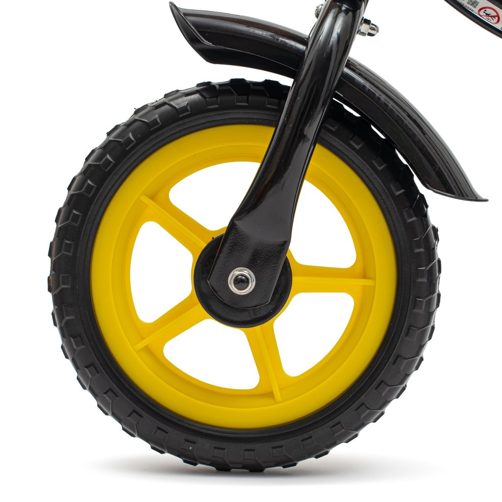 A futóbicikli sárvédőkkel és első fékkel van felszerelve, így az utazás még biztonságosabb, és a gyerekek védve vannak a sártól és a szennyeződésektől.