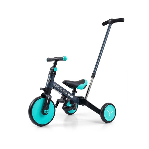 Univerzális gyermek pedálos tricikli Milly Mally Optimus 4az1-ben. Stabil konstrukciójának köszönhetően a legnagyobb biztonságot nyújtja a gyermekeknek. Ennek a triciklinek a legnagyobb előnye a változékonysága. A habkerekek tökéletesen vezetés közben biztosítják a kényelmet és a gyermekek nem fáradnak el.