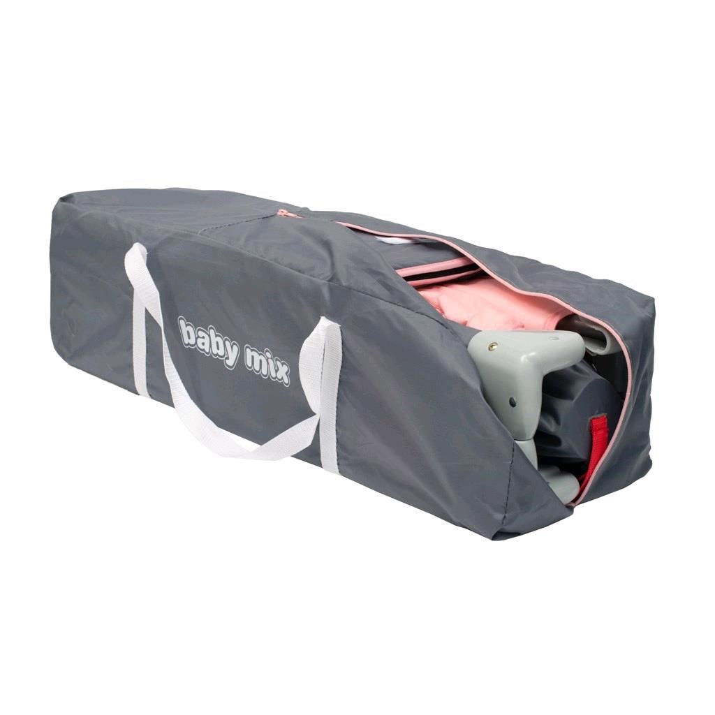 A praktikus hordozható utazóágy Baby Mix nemcsak utazóágynak, hanem járókának is használható. Élvezze az időt babájával, nyaraláskor vagy útközben. Az egyszerű mechanizmusnak köszönhetően gyorsan és egyszerűen összecsukható, beteheti a mellékelt, pántokkal ellátott praktikus táskába, és kényelmesen beteheti az autóba. Az ágy nagyon könnyű, fékkel ellátott kerekekkel van felszerelve, így könnyen áthelyezheti egy másik szobába, teraszra vagy kertbe.