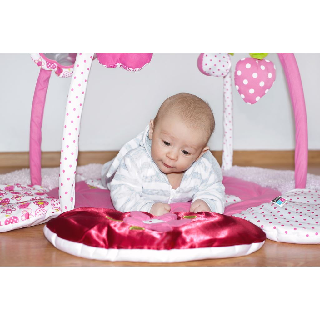 Eredeti fejlesztő játszószőnyeg PlayTo játékhíddal. A játszószőnyeg virág alakú, szép színekkel és játékokkal rendelkezik. A vibráló és mozgó részeknek köszönhetően a tapintást, a látást és a hallást érzékeli. A kellemes és puha anyag lehetővé teszi kényelmes fekvést a hasán vagy a hátán, és lehetővé teszi a gyermek szabad mozgását. A játszószőnyeg tükröt, plüss játékot sípolóval, plüss játékot rágókával és csörgős plüss játékot tartalmaz. A játékok lecsatolhatók és külön használhatók. Az egyszerű konstrukciónak és a hozzájáró táskának köszönhetően egyszerűen hordozható. Mérete: átmérő kb 100 cm, magassága kb 54 cm. 3 hónapos kortól ajánlott.