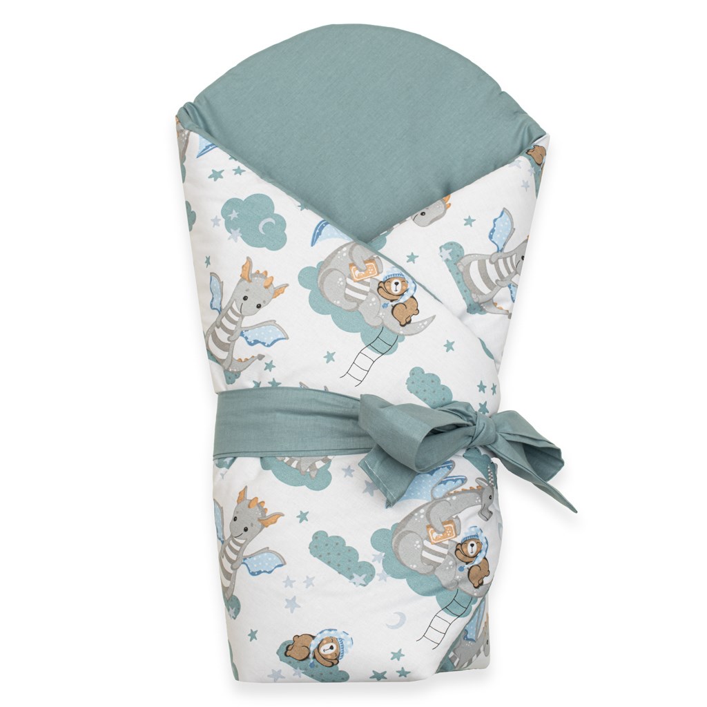 Aranyos baba kétoldalas pólyakendő New Baby Sárkány. Gyönyörű gyermekmotívum aranyos kis, gyönyörködtetni fogja a gyermekszemeket. Puha minőségi anyagból készült, ami kellemes melegséget biztosít a baba számára. A pólyakendő tépőzáras. Mérete cca 80x80 cm. Összetétel: huzat 100% pamut, töltőanyag 100% poliészter.