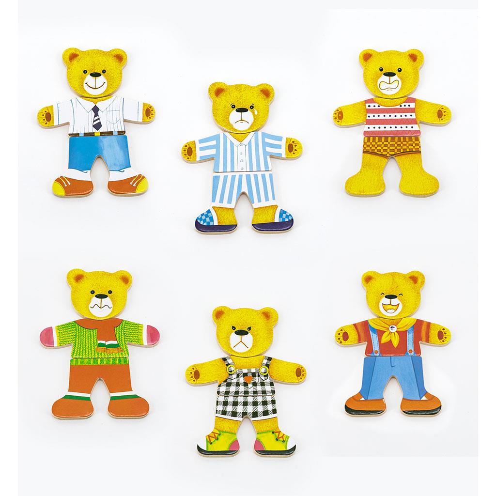 A készlet 18 darabból áll (6 x medve arc - mindegyik más hangulatban, 6 x felső testrész és 6 x rövidnadrág), melyeket bármilyen módon lehet összeállítani egy speciális alátétre, ami egyben a doboz teteje is.