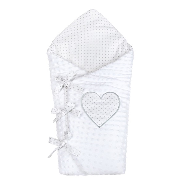 Luxus megkötős pólya Minka New Baby. A pólya hímzett szívecskével díszítve. Kétféle anyagból készült, nagyon puha és kellemes tapintású, sima Minka anyag kiemelkedésekkel és mintás 100% pamut. Nem veszítenek színeik élénkségéből, nem színezi el a többi ruhát és nem okoz allergiás reakciókat.