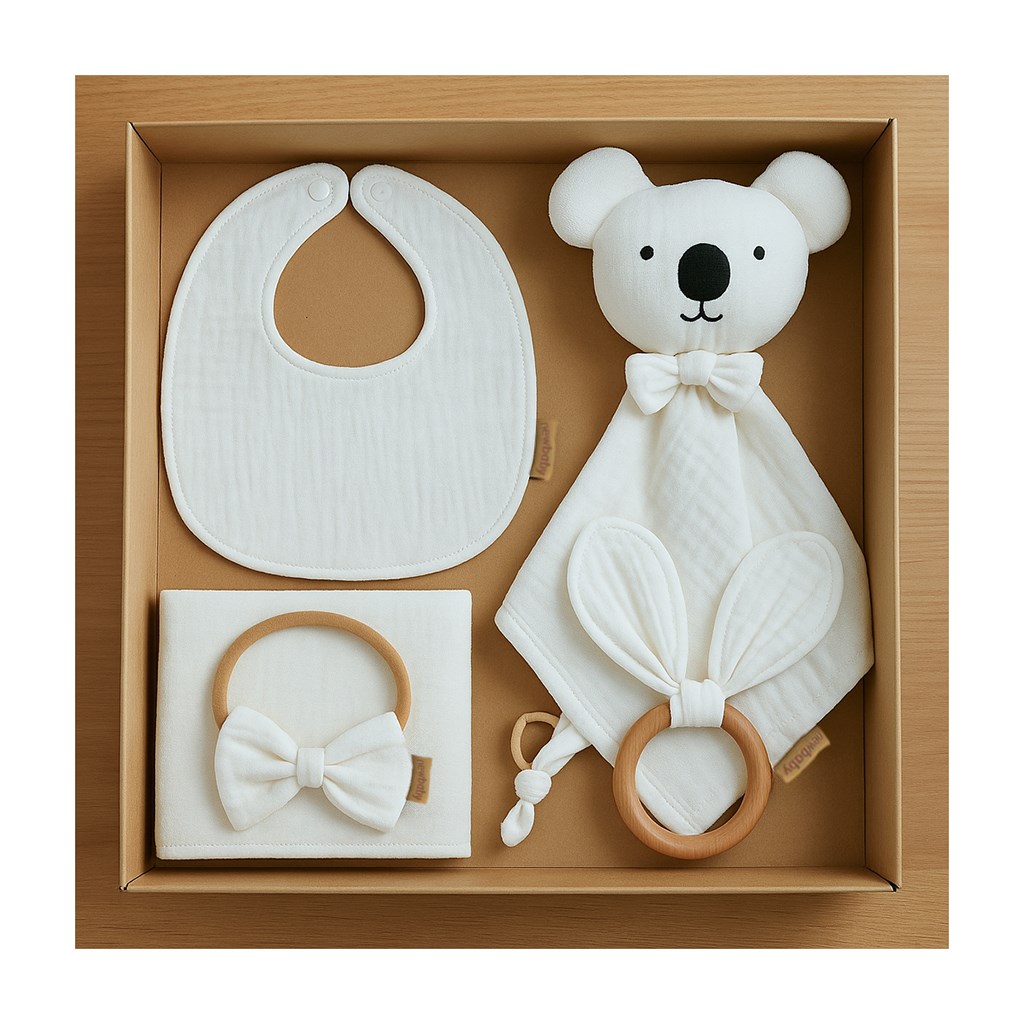 A mu¨szlin „Koala” plüssjáték ideális társ a baba számára már az első napoktól. Rendkívül puha mu¨szlin anyagból készült, biztonságérzetet nyújt, segíti az elalvást és hűséges alvótárssá válik. Minimalista designja és diszkrét színei különös bájt kölcsönöznek neki. Tökéletesen illik a többi mu¨szlin New Baby termékhez, gyönyörű ajándékszettet alkot.