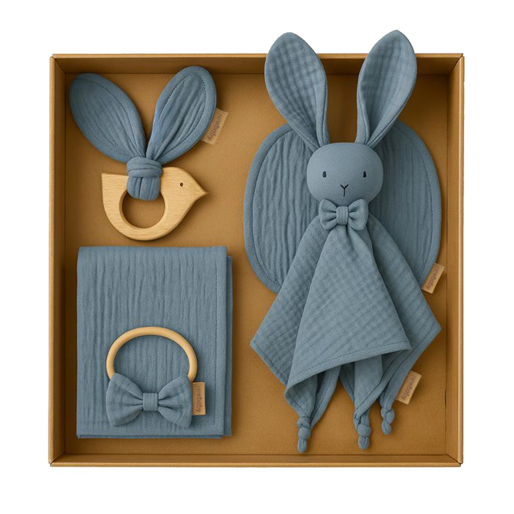 A New Baby különleges ajándékdoboza a legkisebbekre gondolva készült – tökéletes választás babaváró bulira, újszülött köszöntésére vagy bármilyen különleges alkalomra. A szett négy gondosan kiválasztott kiegészítőt tartalmaz, melyek a legfinomabb 100% organikus muszlin pamutból és biztonságos bükkfából készültek – mind megfelelnek az európai szabványoknak és tanúsítványokkal rendelkeznek.